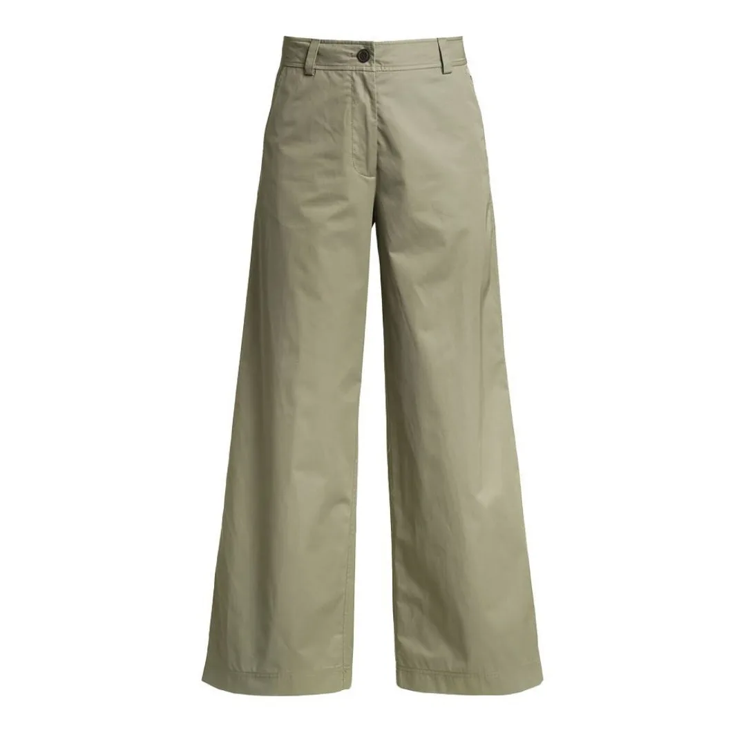 Parajumpers groene broek, wijd uitlopende pijpen, 58% polyester, 42% katoen, ritssluiting, effen groene broek, zakken aan de voor- en achterkant