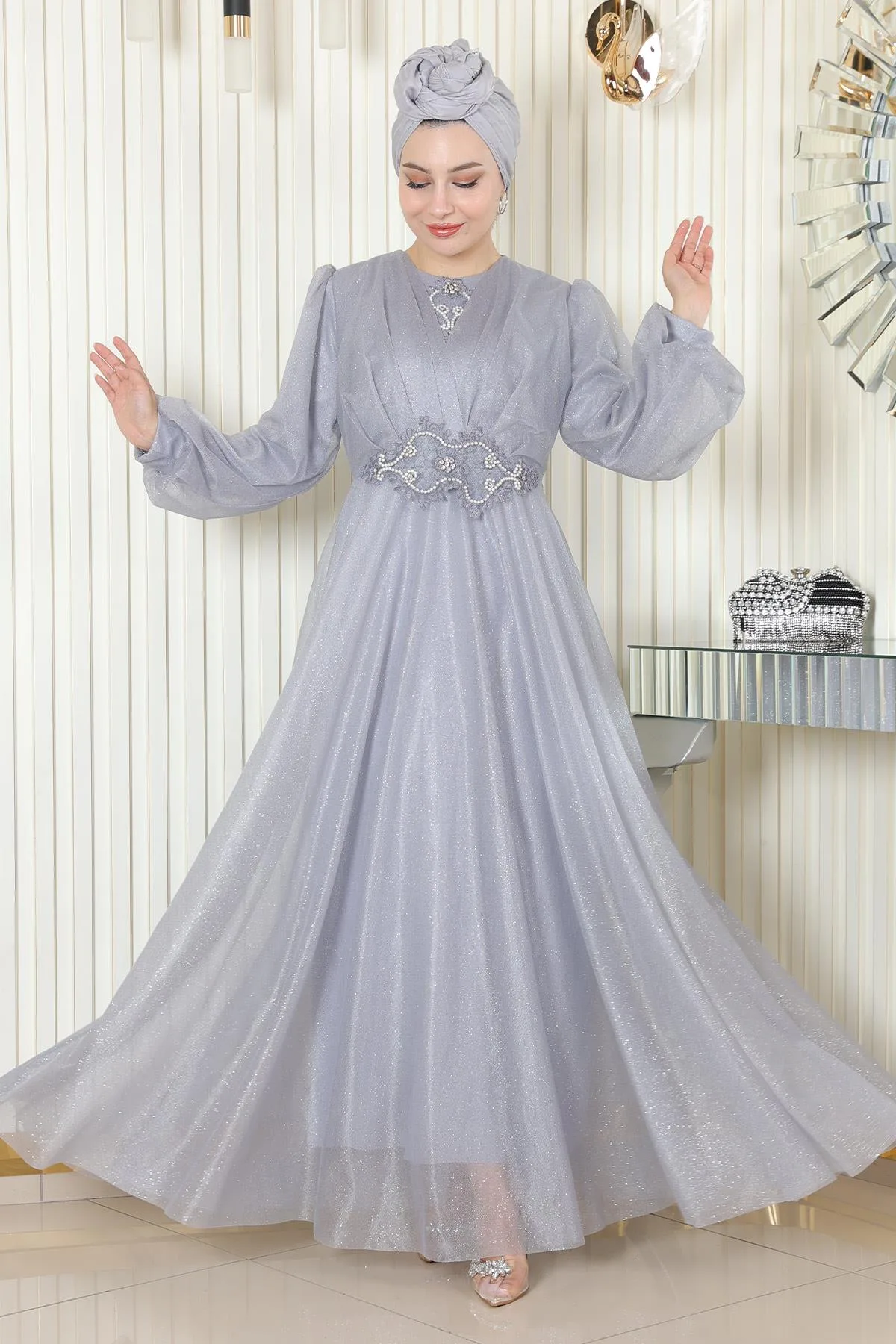 Stofkenmerk: Gemaakt van glinsterende chiffonstof. Productkenmerk: Nieuw seizoens hijab modeproduct. Gevoerd. Achterzijde met ritssluiting. Parel details op de borst en taille. De productkleur kan variëren door conceptfoto's. De model draagt maat 38. De maattabel staat in de afbeeldingen.