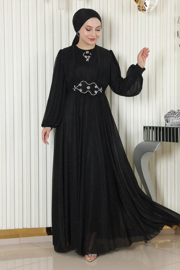 Stofkenmerk: Gemaakt van glinsterende chiffonstof. Productkenmerk: Nieuwe seizoen hijabmodeproduct. Gevoerd. Achterrits aanwezig. Pareldetails op de borst en taille. De productkleur kan variëren door conceptfoto's. Het model draagt maat 38. De maattabel is in de afbeeldingen.