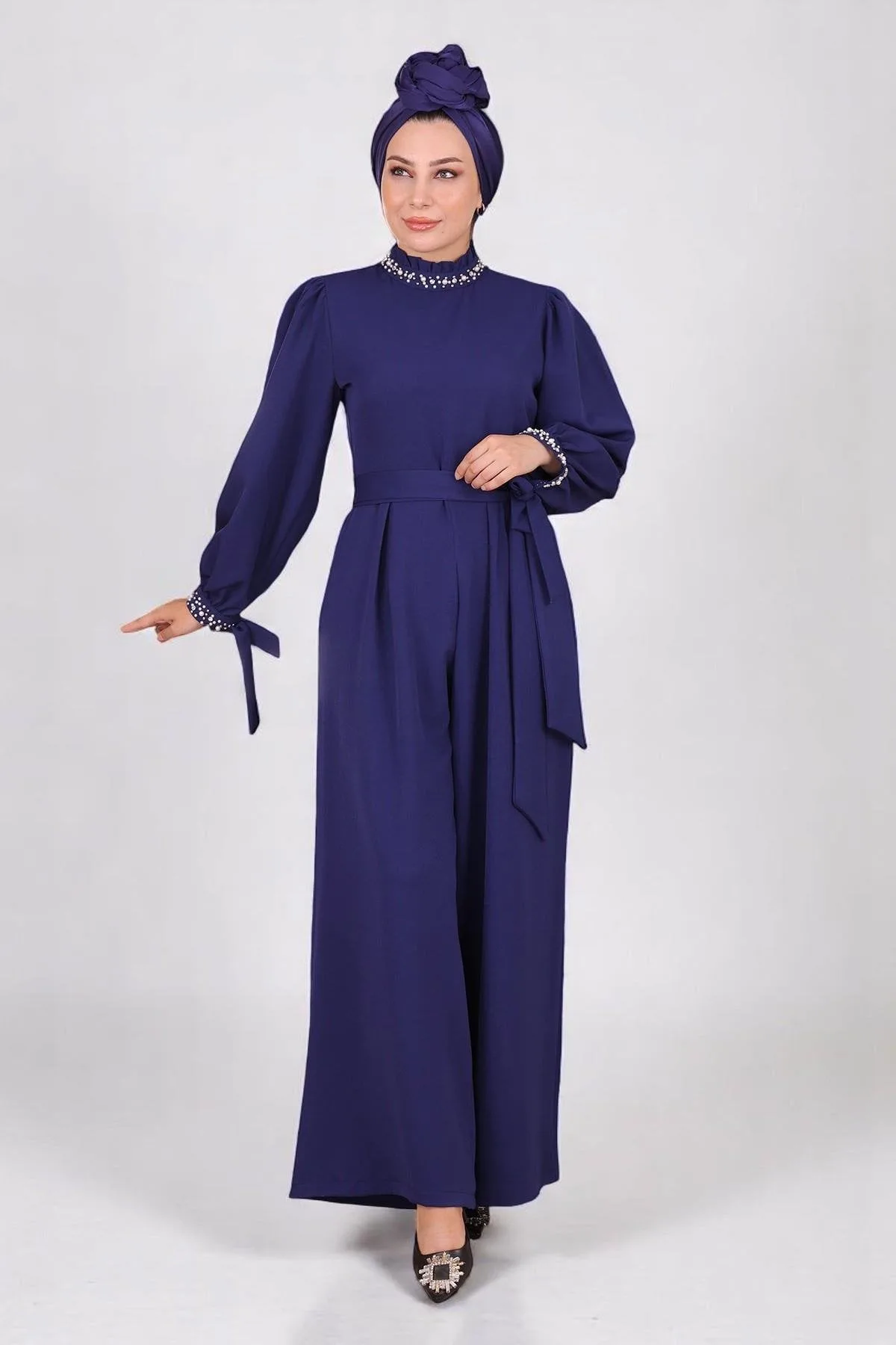 Stofkenmerk: Gemaakt van dubbele stof. Productkenmerk: Nieuwe seizoenshijabmodeproduct. Ongelined. Het heeft een bruikbare rits aan de achterkant. De kraag en manchetten zijn voorzien van pareldetails. De parels zijn gedrukt. De manchetten zijn met kant afgewerkt. De riem is verwijderbaar. De productkleur kan verschillen door conceptopnamen. Het model draagt maat 38. Maat 38 Jumpsuit Dress Afmetingen: Productlengte: 144 cm - Borst: 90 cm - Taille: 80 cm - Heupen: 130 cm Lichaamsmetingen nemen toe met 3 of 4 cm. (Productlengte verandert niet)