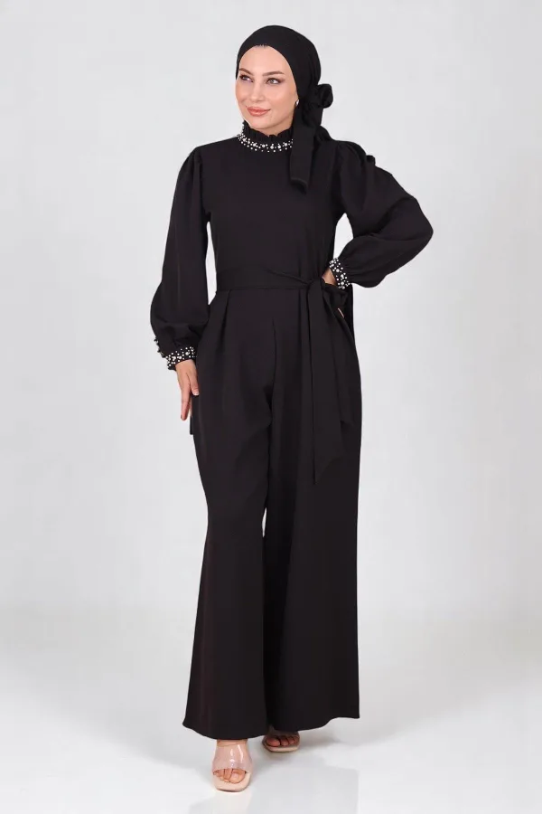 Stofkenmerk: Gemaakt van dubbel weefsel. Productkenmerk: Nieuwe seizoens hijabmodeproduct. Ongevoerd. Het heeft een bruikbare rits aan de achterkant. De kraag en manchetten zijn bezaaid met parels. De parels zijn bedrukt. De manchetten zijn gekruist. De riem is afneembaar. De kleur van het product kan variëren door conceptfoto's. Het model draagt maat 38. Maat 38 Jumpsuit Jurk Afmetingen: Productlengte: 144 cm - Borst: 90 cm - Taille: 80 cm - Heupen: 130 cm Lichaamsafmetingen nemen met 3 of 4 cm toe. (Productlengte verandert niet)
