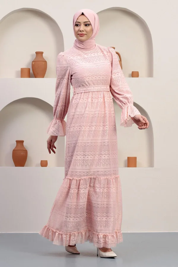 Stofkenmerk: Gemaakt van kantstof. Productkenmerk: Nieuw seizoens hijab modeproduct. Het is gevoerd. Het heeft een bruikbare rits aan de achterkant. De riem is verwijderbaar. De manchetten en de riem zijn parelgedetailleerd. De kleur van het product kan verschillen door conceptopnamen. Het model draagt maat 38. Maten van de Avondjurk in maat 38: Producthoogte: 142 cm - Borst: 82 cm - Taille: 80 cm - Heupen: 90 cm. Lichaamsmetingen nemen met 3 of 4 cm toe. (Productlengte verandert niet)