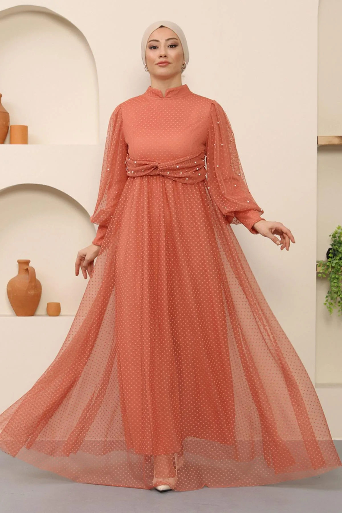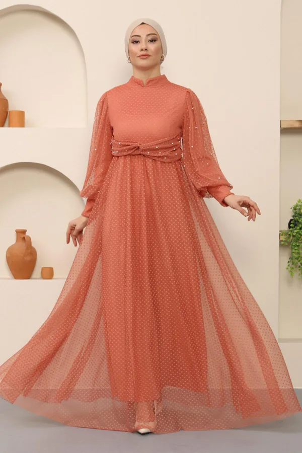 Stof Kenmerk: Gemaakt van tule stof. Product Kenmerk: Nieuwe seizoen hijab modeproduct. Het is gevoerd. Het heeft een bruikbare rits aan de achterkant. Mouwen met plooien en kraag bij de taille zijn met parels gedetailleerd. De productkleur kan verschillen door conceptfoto's. Het model draagt maat 38. Maat 38 Avondjurk Maten: Product Hoogte: 145 cm - Borst: 80 cm - Taille: 78 cm - Heupen: 90 cm Lichaamsmaten nemen met 3 of 4 cm toe. (Productlengte verandert niet)
