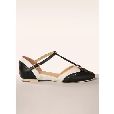 Specificaties: Parisienne t-strap flats in zwart en crème