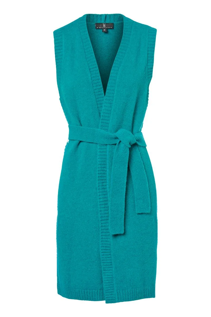 Gebreid Lang Gilet in Stijlvol AquagroenHet lang gebreide gilet Parker is een ontwerp waarin je je het liefst nooit meer uitkleedt. Dit mouwloze vest van Mart Visser is een prachtige toevoeging aan je garderobe. De aquagroene kleur geeft het gilet een schitterende uitstraling. Het lange ontwerp geeft het item een eigentijdse look. Bovendien is het gemaakt van een zachte wolmix, waardoor het uiterst comfortabel en warm draagt. Het Parker vest heeft een luxe uitstraling en is geschikt voor diverse gelegenheden, zowel casual als formeel. De afneembare band in de taille biedt de mogelijkheid om het vest naar wens te tailleren. Verder is het mouwloze vest voorzien van verfijnde designerdetails, zoals splitjes aan de zijkanten en luxe ribboorden bij de armsgaten, zijnaden en onderzoom, die extra stijl en flair toevoegen aan het ontwerp. Het Parker gilet is een veelzijdig en trendy kledingstuk dat comfort en stijl combineert. Door het te combineren met andere items uit de Mart Visser collectie creëer je een eigentijdse en warme winterlook. De aquagroene kleur komt ook terug in andere kledingstukken van de nieuwe collectie van Mart Visser, zoals de Dhalia print jurk of de Simona print blouse. Op zoek naar een ton-sur-ton look? Draag het gilet als extra laag over de aquagroene Angy trui. Met het Parker gilet ben je helemaal klaar voor een trendy, modieuze en warme winter!"