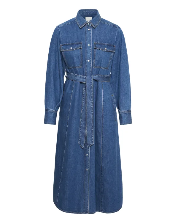 Denim jurk met gestructureerde pasvorm, overhemdkraag en lange mouwen. Knoopsluiting voor, ceintuur in de taille. Opgestikte borstzakken en midi-lengte maken de look compleet.