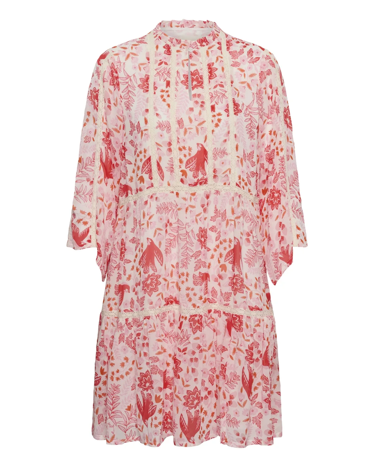 Design: Keyholesluiting; Type sluiting: Knoopsluiting; Materiaal: Viscose; Halstype: Opstaande kraag; Details: Kant, Gedrapeerd; Extra's: All-over patroon; Lengte: Knielengte; Pasvorm: Normale pasvorm; Armlengte: Driekwart mouw