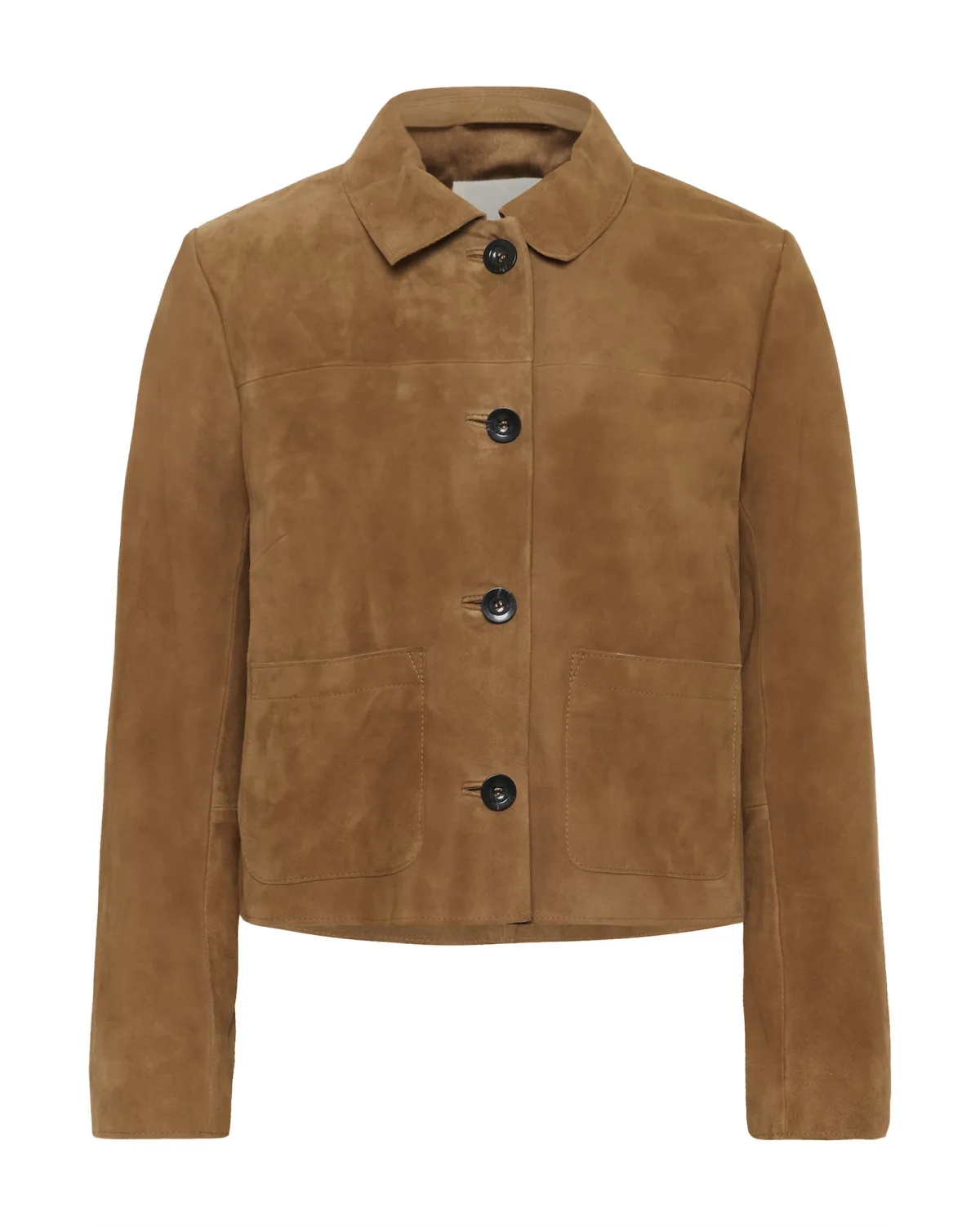 Kort suède jack met boxy pasvorm, klassieke overhemdkraag en vierknopen-sluiting. Voorzien van opgestikte zakken en rechte lange mouwen.