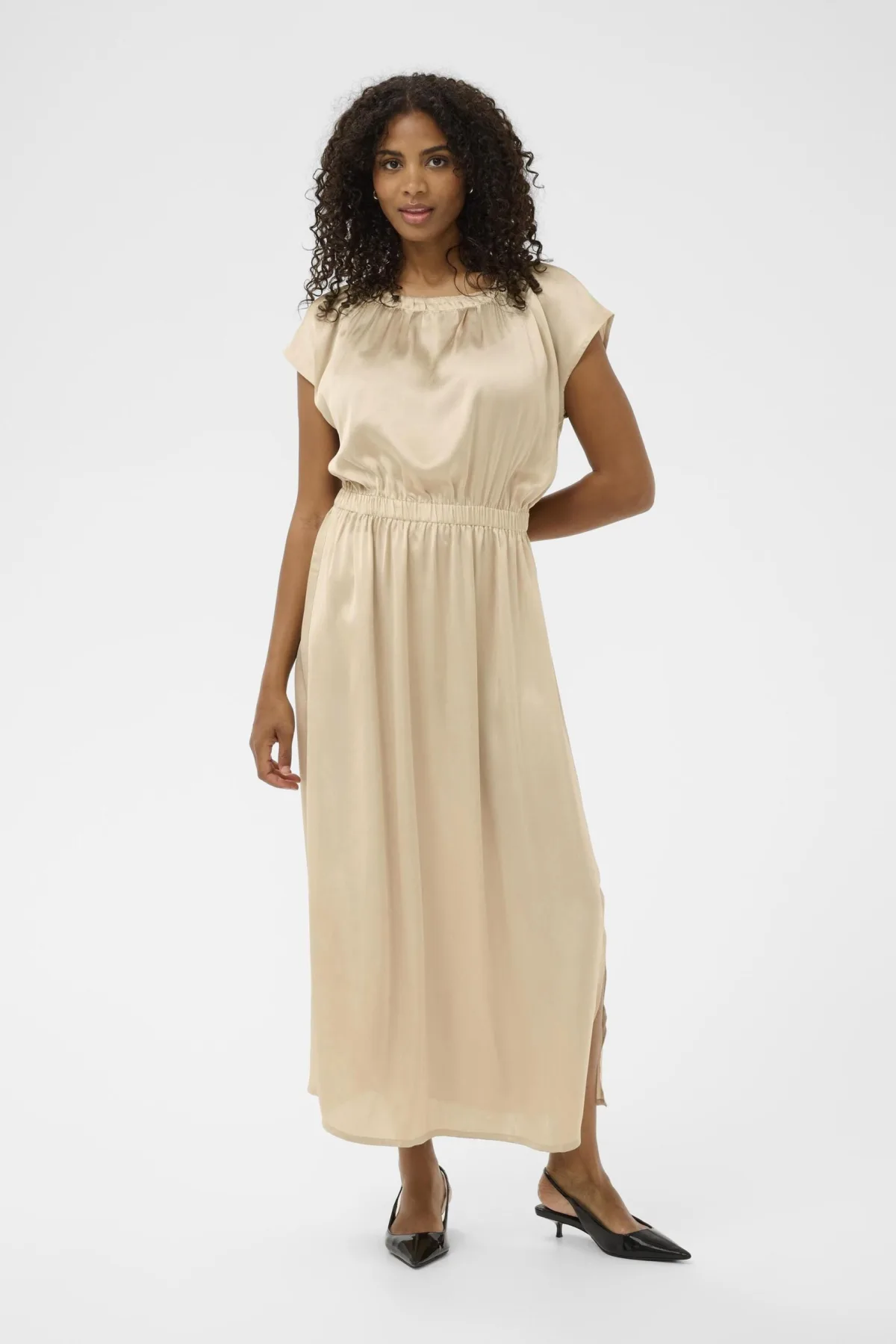 Deze maxi-jurk heeft een rechte pasvorm, ronde hals met plooien, korte mouwen en een elastische tailleband. Subtiele zijslit en glanzende finish.