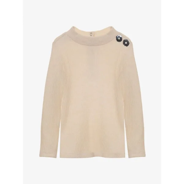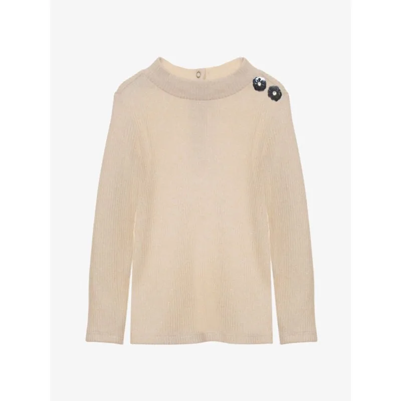 De Patachou Top in Ivory heeft een ribkwaliteit met goudkleurig lurex draadje. De top heeft een drukknoopluiting aan de achterkant en twee bloemen met zwarte pailletten op de schouder. Combineer met de bijpassende Patachou short.