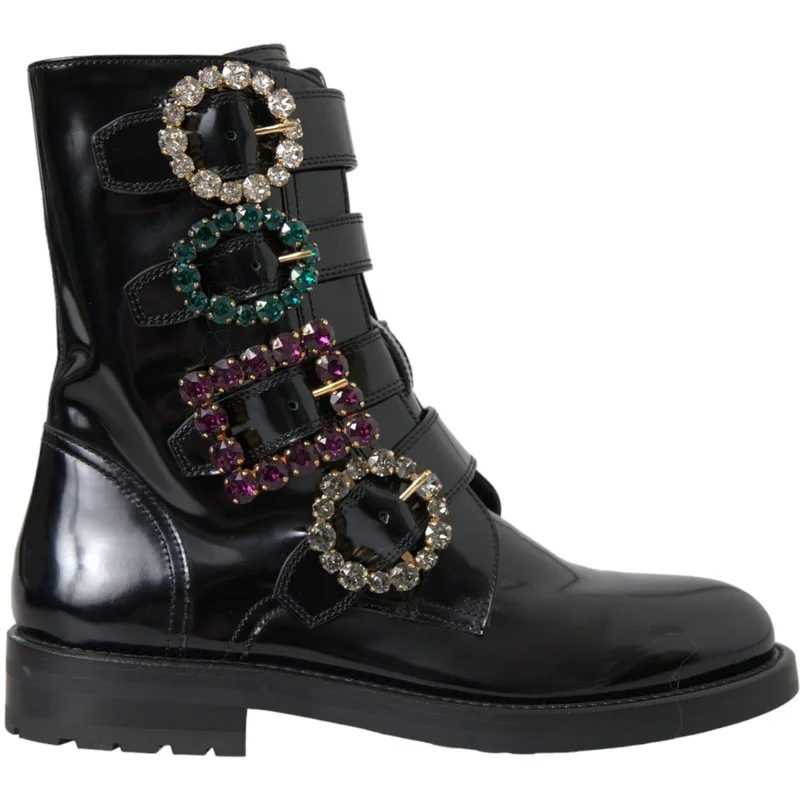 Stap naar buiten, schitter en straal! Deze exquisite enkellaarsjes bieden luxe met een edgy twist. Geniet van high-fashion glamour die elke outfit verheft. De meerdere kristallen gespen voegen verfijning toe en trekken overal de aandacht. Ervaar een ruime, natuurlijke pasvorm met het ronde teenontwerp. Het duurzame, onderhoudsvriendelijke lakleer zorgt voor een blijvende stijl. Perfect voor avondgelegenheden of speciale gelegenheden, deze laarzen integreren naadloos in jouw glamoureuze levensstijl. Veeg schoon voor gemakkelijke verzorging.