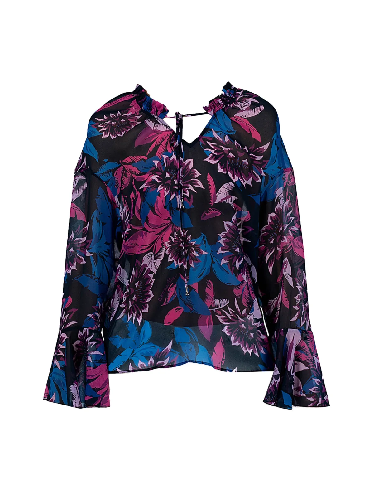 Los gesneden Transparant Met lange mouwen V-hals Aanvullend geknoopt met bedrijfsdetail bij de halslijn Lange mouwen met manchetten met ruches Versierd met een bloemenpatroon Gemaakt van hoogwaardige stof