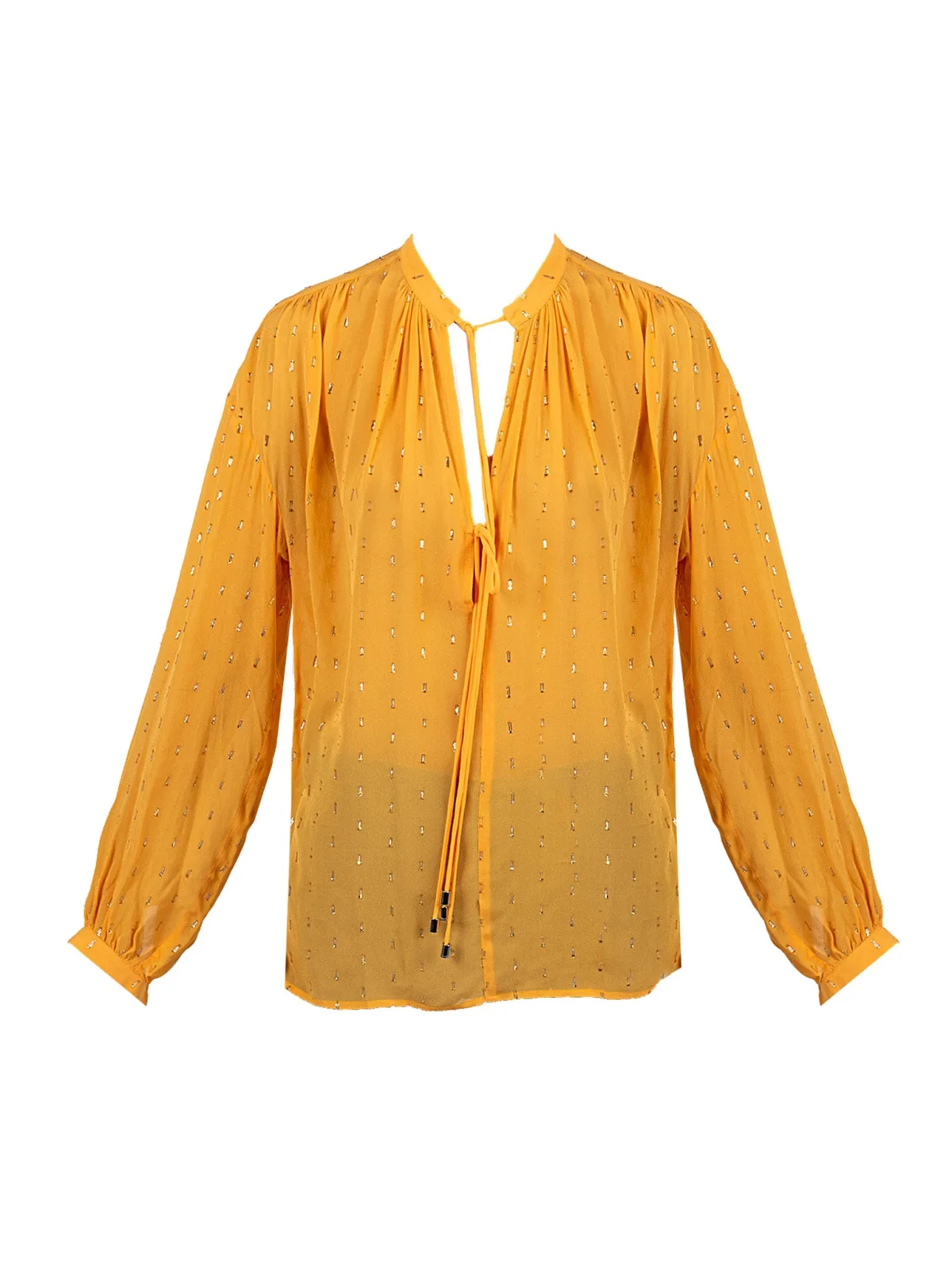 Eenvoudige stijl Transparant Met een patroon van metallic draden Diepe V-halslijn Halslijn versierd met kenmerkende bandjes Lange mouwen Mouwen eindigen met gebonden manchetten Splitjes aan de zijkant Gemaakt van hoogwaardige stof