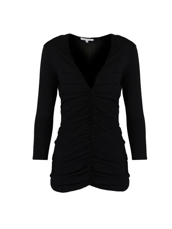 Met een diepe V-hals die de halslijn subtiel benadrukt en elegantie en vrouwelijke charme toevoegt aan elke stylingcombinatie. De nauwsluitende snit benadrukt perfect het silhouet en biedt comfort en zelfvertrouwen in elke situatie. Met een gerimpelde voorkant die het kledingstuk een uniek karakter en luchtigheid geeft en een indrukwekkend spel van licht en schaduw op het materiaal creëert. Met 3/4-mouwen die een uitstekende keuze zijn voor elk seizoen en functionaliteit combineren met een modieuze look. Een merkdetail bij de hals, dat een subtiele uitdrukking is van kwaliteit en prestige en discreet het merk van het product benadrukt. Gemaakt van hoogwaardige stof die niet alleen prettig aanvoelt, maar ook vele seizoenen lang meegaat en vormvast is.