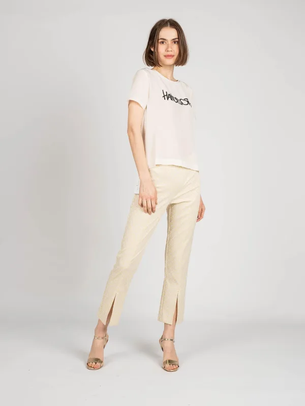 Eenvoudige vorm Middelhoge taille Licht taps toelopende beenuiteinden Ritssluiting aan de zijkant Split aan de voorkant van de benen Twee imitatiezakken en vormgevende coupenaden op de rug Gemaakt van hoogwaardige stof