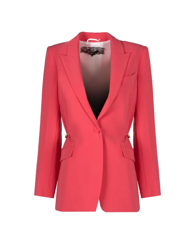 Sluit met een knop, waardoor het een klassieke charme en functionaliteit heeft, ideaal voor dagelijks gebruik maar ook voor elegante gelegenheden. Twee zakken aan de voorkant die niet alleen stijl toevoegen, maar ook praktisch zijn en waar je kleine spullen zoals sleutels of een telefoon in kunt opbergen. Een afneembare kettingriem om aan de voorkant te dragen is een uniek detail waarmee je de look kunt personaliseren en aanpassen aan je eigen voorkeuren terwijl het een vleugje moderniteit toevoegt. Metalen elementen in goud benadrukken het luxueuze karakter van het product en introduceren een elegant accent dat de aandacht trekt en glamour toevoegt aan elke stijl. Licht getailleerd, wat het figuur subtiel benadrukt en tegelijkertijd comfort en een perfecte pasvorm biedt voor verschillende lichaamstypes. Gevoerd voor extra comfort en duurzaamheid, terwijl de buitenstof wordt beschermd en langer meegaat. Ingebouwde schoudervullingen voegen structuur en elegantie toe en creëren een geraffineerde en professionele look die in elke situatie goed werkt. Gemaakt van hoogwaardige stof, die garant staat voor duurzaamheid, comfort en een elegante look die zeker de aandacht zal trekken en wow met zijn afwerking. Made in Italy, wat staat voor uitstekend vakmanschap en aandacht voor detail, kenmerkend voor de Italiaanse mode, die bekend staat om de hoogste kwaliteit en onmiskenbare stijl.