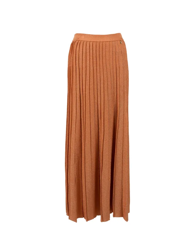 De eenvoudige snit van deze rok maakt hem uiterst universeel, ideaal voor zowel alledaagse als formelere gelegenheden, en voegt elegantie toe aan elke stijl. Met een elastische tailleband biedt het niet alleen comfort maar ook een perfecte pasvorm voor het silhouet, waardoor het de ideale keuze is voor mensen die van comfort houden. De geplooide structuur, versierd met metallic garen, geeft de rok een unieke glans en subtiele charme, trekt de aandacht en geeft het een speciaal karakter. Een merkspecifiek detail op de tailleband is een elegant accent dat de afwerkingskwaliteit en het prestige van het merk benadrukt en de rok een onmiskenbare stijl geeft. De rok is gemaakt van hoogwaardige stof en is niet alleen duurzaam maar voelt ook prettig aan, waardoor het een echt plezier is om te dragen.