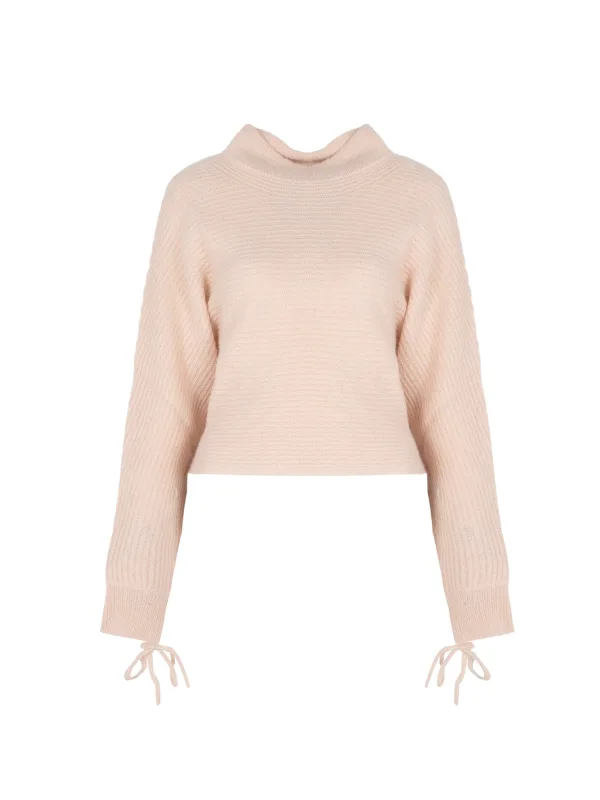 De kortere snit van deze trui is een uitstekende keuze voor mensen die hun figuur willen benadrukken en hun outfit een modern karakter willen geven dat perfect combineert met broeken of rokken met hoge taille voor een modieuze en chique look. De uniforme kleur van de trui maakt het een veelzijdig kledingstuk dat gemakkelijk gecombineerd kan worden met verschillende accessoires en patronen, waardoor zowel elegante als casual outfits gecreëerd kunnen worden. De opstaande kraag voegt niet alleen elegantie toe, maar zorgt ook voor extra warmte op koudere dagen, waardoor het een ideale keuze is voor de herfst- en wintermaanden wanneer comfort en stijl hand in hand gaan. De gestrikte koorden aan de mouwen zijn niet alleen een praktisch element waarmee je de lengte kunt aanpassen, maar geven de trui ook een unieke en modieuze touch die de aandacht trekt en de individuele stijl benadrukt. Een merkdetail op de achterkant van de trui is een subtiel maar geraffineerd accent dat getuigt van de hoge kwaliteit van afwerking en aandacht voor detail, en prestige en exclusiviteit toevoegt aan elke outfit.