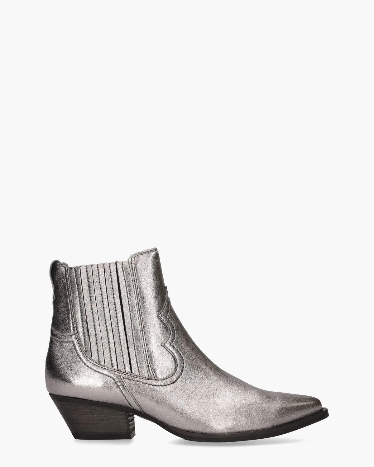 Enkelboots voor dames 8144-036 van Paul Green. Gemaakt van hoogwaardig zilverkleurig leer met een verborgen elastische band aan de zijkant, biedt dit paar een stoere Western-look. Aan de binnenzijde hebben de laarsjes een vaste en zachte lederen voering. De Cowboytrend wordt versterkt door de gestikte afwerking rond de 12 cm hoge schacht en