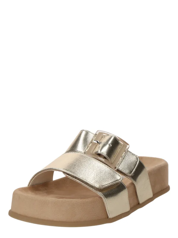 Design: Anatomisch gevormd voetbed, Klittenbandsluiting, Profielzolen, Verstelbare riemen; Type sluiting: Slip; Motief: Effen; Plateau: Met plateau; Materiaal: Imitatieleer; Schoenneus: Open toe; Extra's: Flexibele zool, Metallic look; Hakhoogte: Platte hak (0-3 cm)
