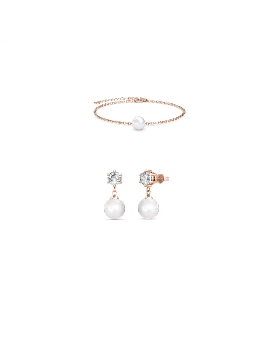 Samenstelling: Messing Afwerking: 18k Roségoud verguld Steensoort: Oostenrijkse parel Type steen: Oostenrijks kristal Aantal stenen (pces): 2 Kleur steen: Kristal Lengte armband (mm): 180 + 55 Lengte oorbellen (mm): 17