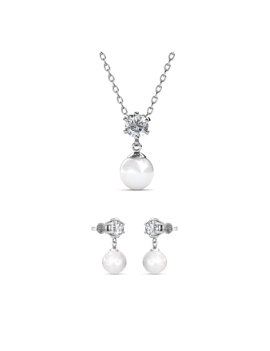 Samenstelling: hoogwaardig messing Afwerking: gerhodineerd Steensoort: Oostenrijkse parel van zeer hoge kwaliteit en Oostenrijks kristal Aantal stenen (stuks): 3 Steenkleur: kristal Kettinglengte: 400 + 50 Lengte oorbellen (mm): 17