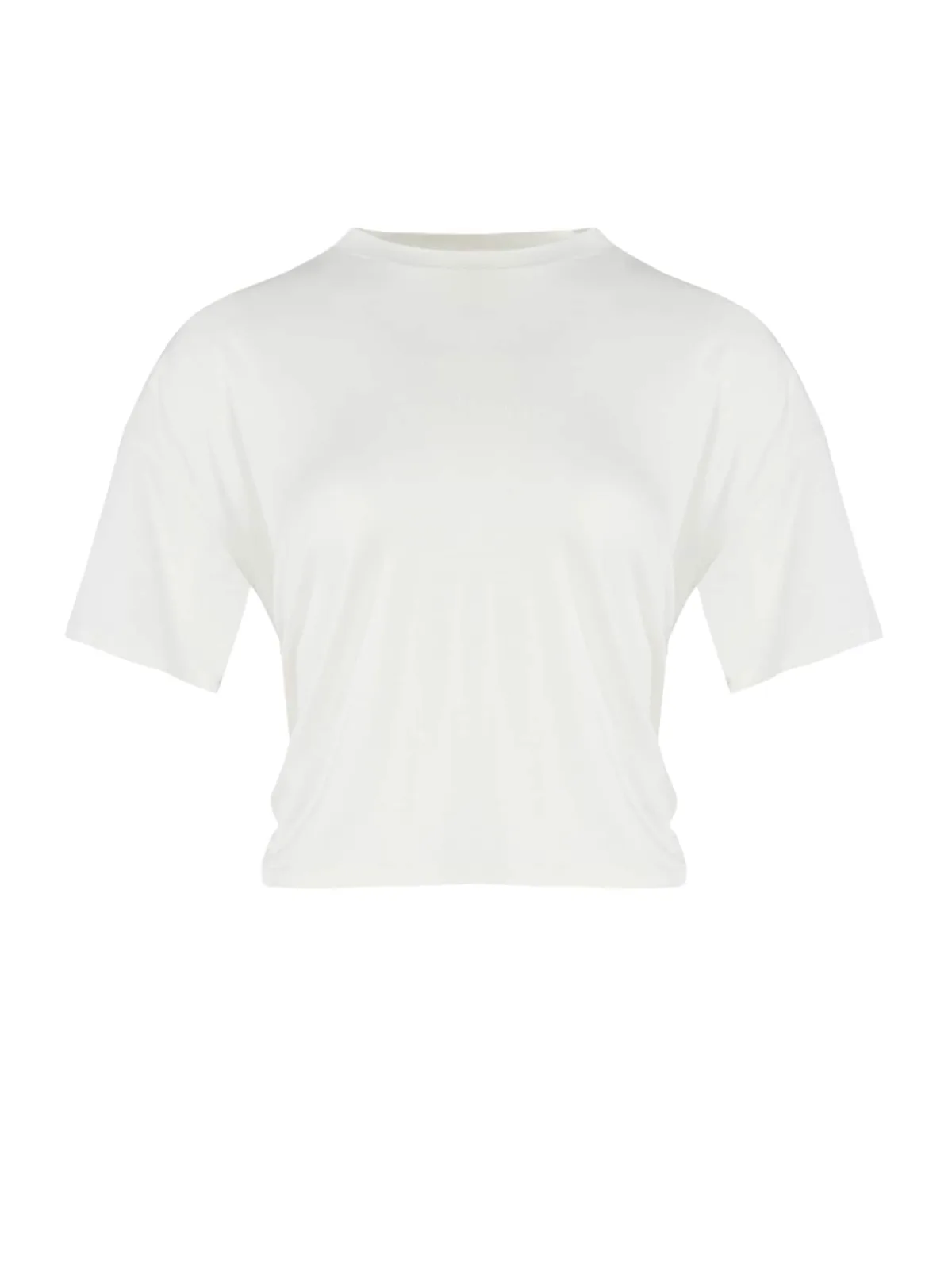 Design: Gevoerde zoom/rand; Materiaal: Jersey; Halstype: Ronde hals; Motief: Effen; Details: Gedrapeerd; Extra's: Voelt zacht aan; Pasvorm: Normale pasvorm; Armlengte: Kwartmouw; Lengte: Korte pasvorm