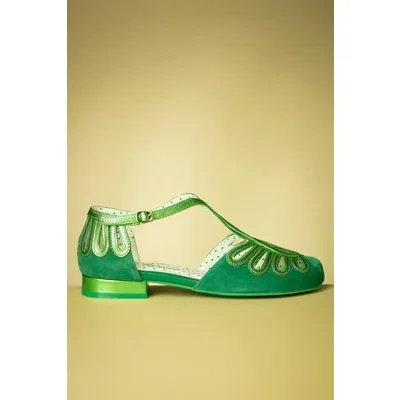 ''Let's go green!'' Deze platte cuties zijn uitgevoerd in hoogwaardig grasgroen suède met metallic details en sierlijke uitsneden. * Samenwerking met 'Shoefun' uit Australië * Ballerina * Cut-outs * Stevige, lage hak * T-strap bandje * Verstelbaar enkelbandje voorzien van handige haaksluiting * Lederen binnenzool voorzien van comfy foam * Rubberen antislip-zool