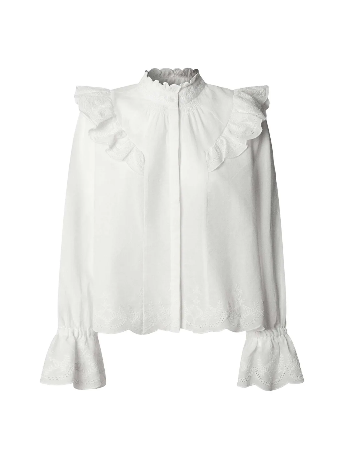 Blouse type: Klassieke blouse; Design: Geschulpte zoom; Type sluiting: Knoopsluiting; Materiaal: Katoen; Motief: Effen; Kraag: Opstaande kraag; Details: Borduursels, Volant; Extra's: Op staal naden; Pasvorm: Normale pasvorm; Armlengte: Lange mouw; Lengte: Normale lengte
