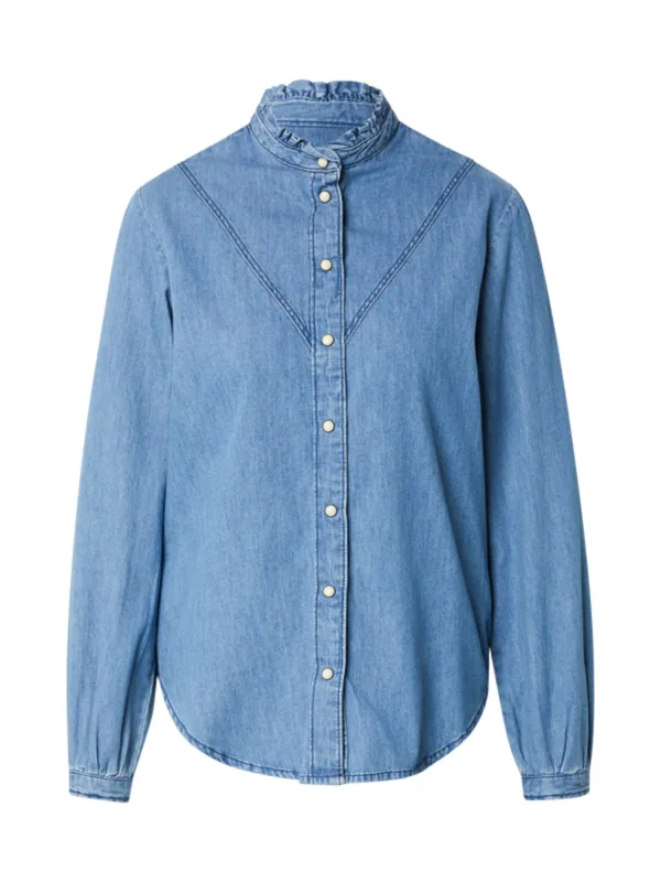 Blouse type: Klassieke blouse; Design: Gevoerde zoom/rand, Drukknopen, Rechte zoom; Type sluiting: Drukknoop; Materiaal: Denim; Motief: Effen; Kraag: Opstaande kraag; Details: Ruches, Gedrapeerd; Extra's: Op staal naden, Gewassen effect; Pasvorm: Normale pasvorm; Armlengte: Lange mouw; Lengte: Normale lengte