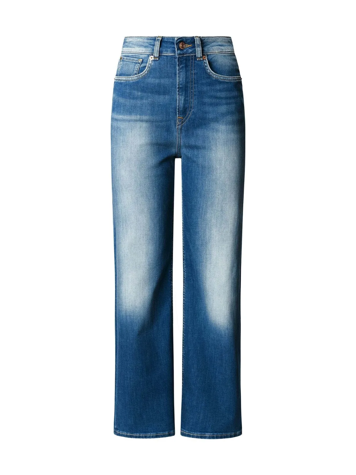 Design: Ritssluiting, 5-pocket-style; Type sluiting: Knoopsluiting; Materiaal: Denim; Motief: Effen; Details: Patches; Extra's: Studs, Gewassen effect, Riemlussen; Wassing: Heavy washed; Lengte: 7/8 lengte; Pasvorm: Wide leg; Taillehoogte: High waist