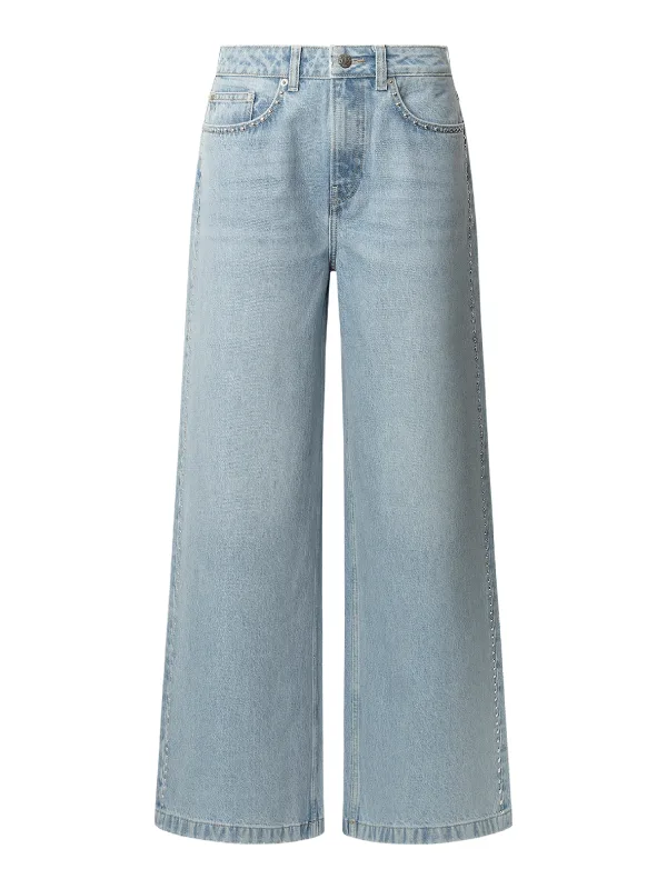 Design: Gevoerde zoom/rand, Ritssluiting, 5-pocket-style; Type sluiting: Ritssluiting; Materiaal: Denim; Motief: Effen; Extra’s: Studs, Contrasterende naden, Vaste grip, Riemlussen; Wassing: Light washed; Lengte: Lang/maxi; Pasvorm: Wide leg; Taillehoogte: Mid waist