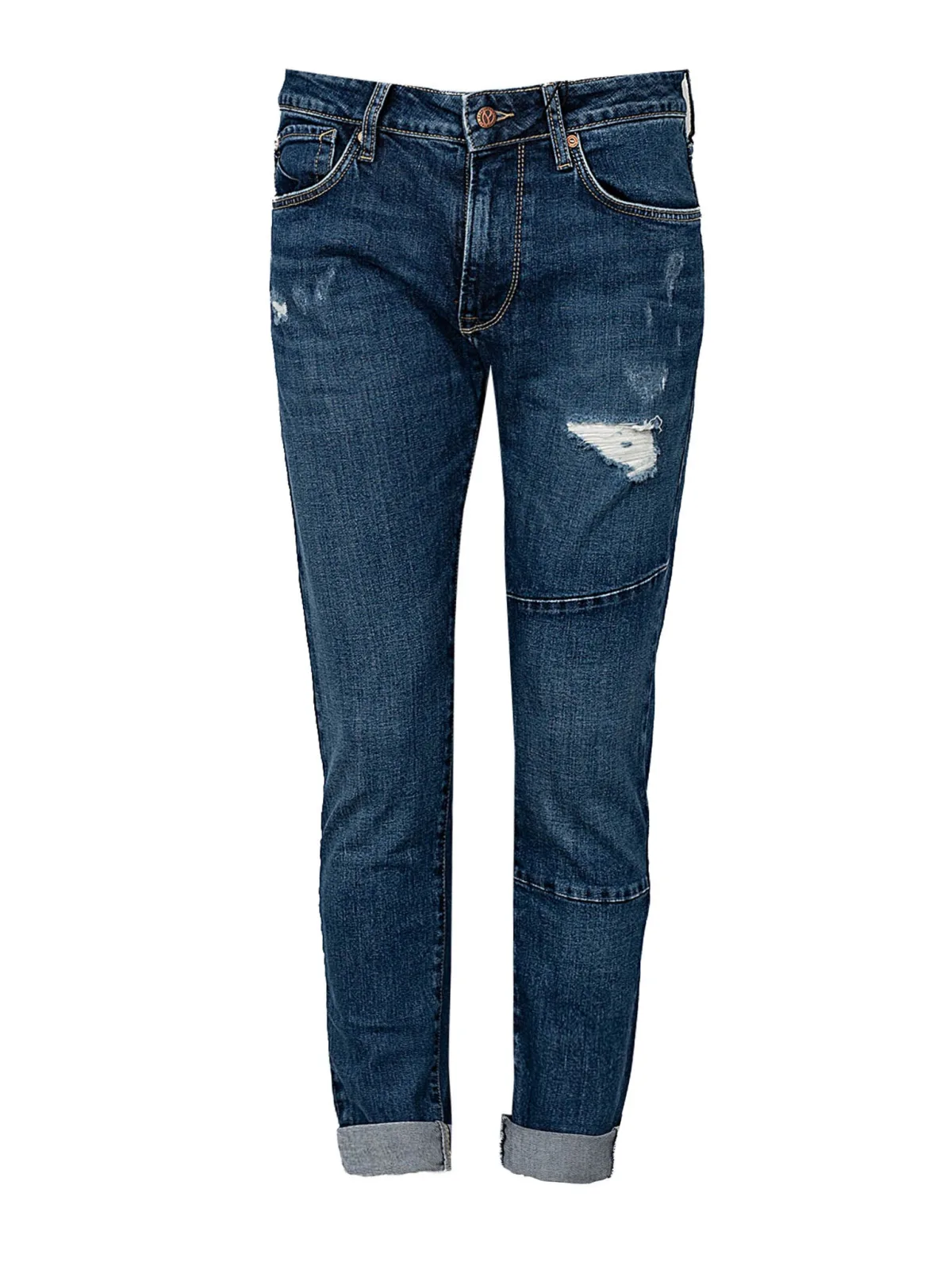 Taps toelopende snit Midden in de taille (Mid Waist) Met ritssluiting en kenmerkende knoop Drie zakken voor, twee achter Broekspijpen met gebruikte effecten en gebruikssporen Broekspijpen kunnen worden opgerold Bedrijfspatch op de achterkant Gemaakt van stretch denim van hoge kwaliteit