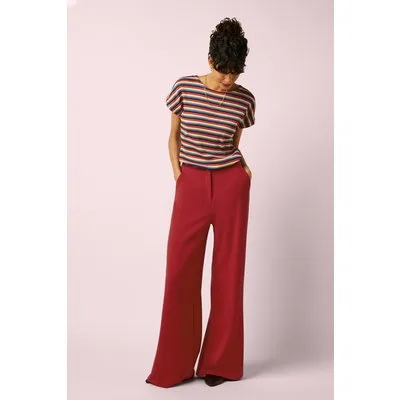 Een echte wardrobe essential! Deze Peppa broek heeft een hoge taille, wijde pijpen en handige zijwaartse steekzakken. Uitgevoerd in een soepele, donkerrode stof met een hele lichte stretch voor een verrassend comfortabele pasvorm. Op zoek naar een broek die je op en top vrouw laat voelen? Peppa is your girl! * Flatterende hoge taille * Zijwaartse steekzakken * Rits- met knoopsluiting voorzijde * Wijde pijpen