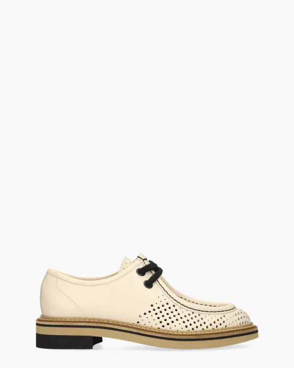 Veterschoenen voor dames 32290 uit de collectie van het Spaanse merk Pertini. Het bovenwerk van dit opvallende model is uitgevoerd in zacht gestructureerd off-white leer dat op het voorblad geperforeerd is. De binnenzijde is ook volledig in leer uitgevoerd, inclusief een lederen uitneembaar voetbed. Op de crêpezool en hak van 4 cm met een