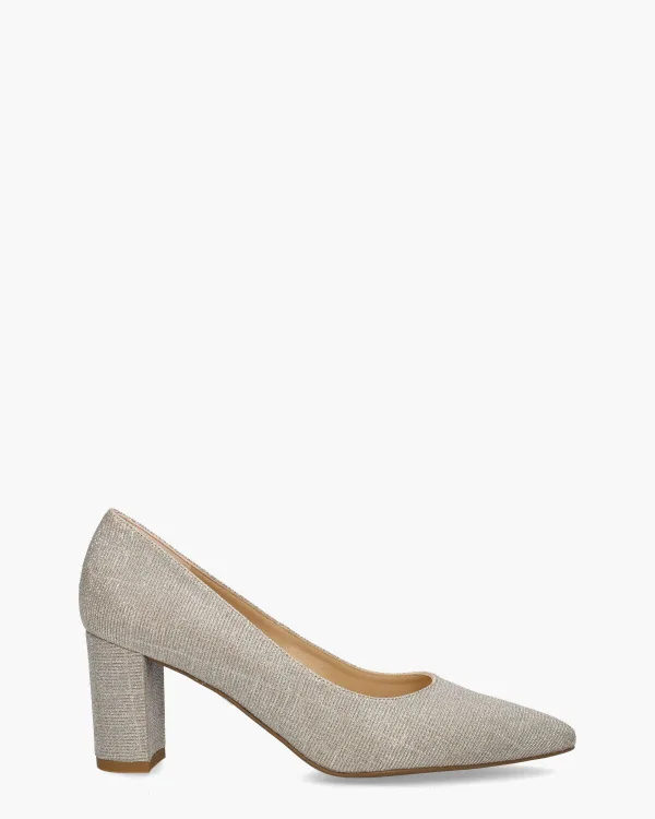 Damespumps, model 67501/049, uit de collectie van Peter Kaiser. Deze elegante schoen heeft een bovenwerk van beige/zandkleurig textiel met een subtiele glinstering. De binnenkant is volledig gevoerd met leer en voorzien van een suède hielversteviging voor ultiem comfort. Met een blokhak van ongeveer 7 cm hoog en een spitse neus