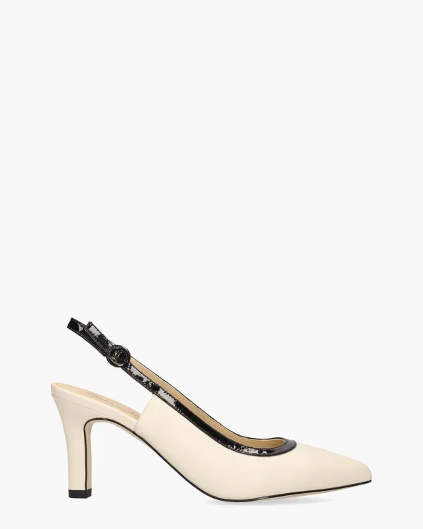 Slingbackpumps voor dames 79640/44 uit de collectie van Peter Kaiser. Dit ontwerp, op een spitse leest, heeft een upper van gebroken wit leer afgewerkt met zwart lakleer wat dit model een klassieke Chanel-look geeft. Met de gesp kun je het hielbandje naar wens verstellen. De binnenkant is volledig in leer uitgevoerd en de hak heeft een