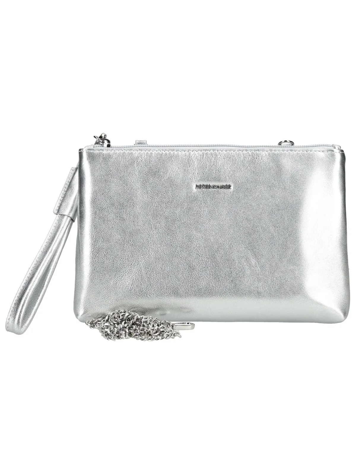 Design: Afneembare banden, Ruim hoofdvak; Type sluiting: Ritssluiting; Materiaal: Leer; Motief: Effen; Materiaal: Glad leer; Extra's: Label plaatje, Stevige stof, Draagbaar op 2 manieren, Metallic look; Maat: Klein; Hengsellengte: Lange schouderriemen, Korte schouderriemen