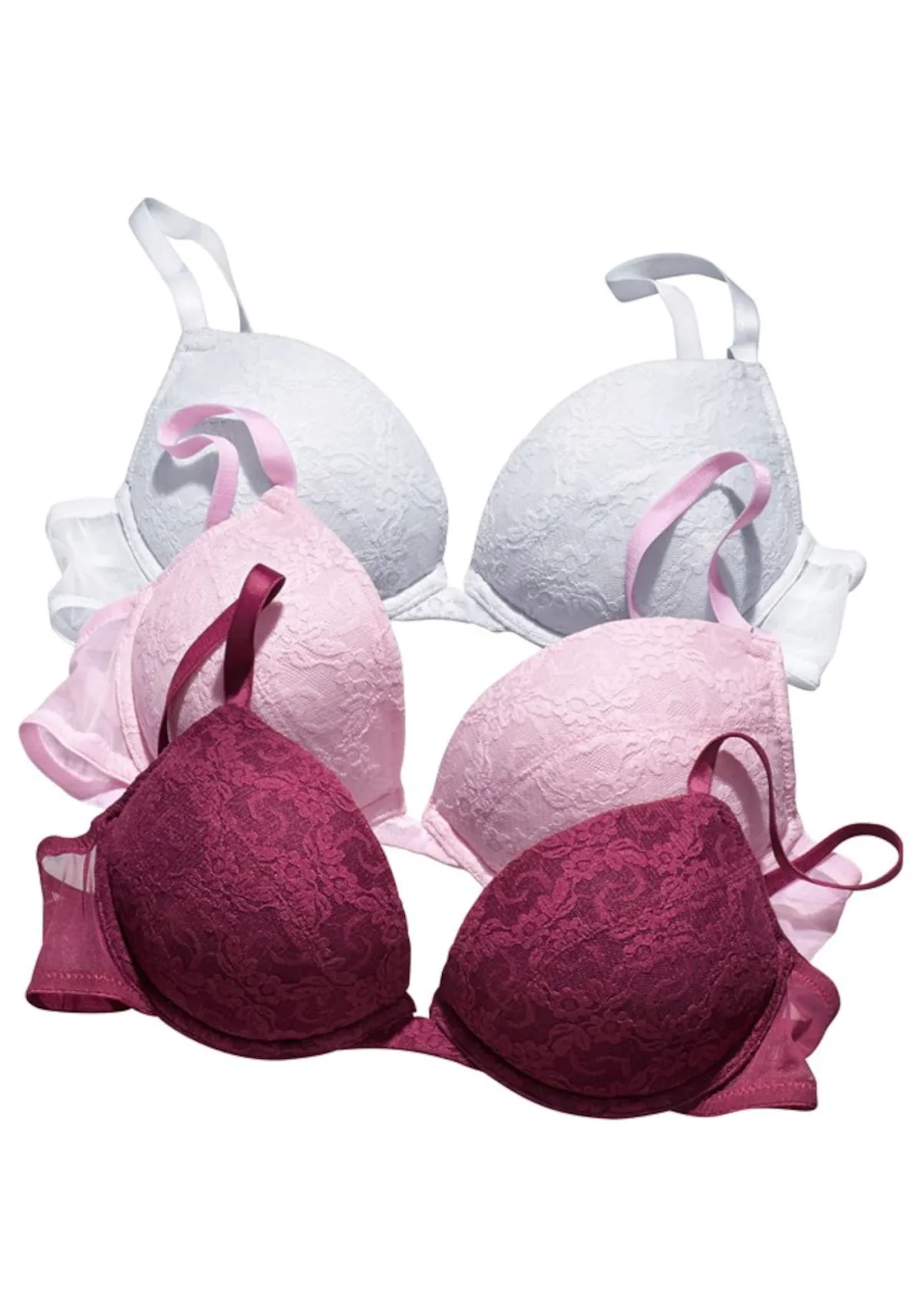 Cup soorten: Full cup bh, Uitneembare cups; Soort bandjes: Normale bandjes; Bh/bikini type: Push-up; Beugel: Met beugel; Motief: Effen; Details: Kant; Extra's: Verstelbare bandjes; Kleuren per verpakking: Meerdere kleuren per verpakking; Aantal: 3 Pack