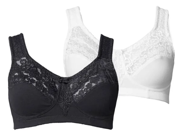 Cup soorten: Soft cup bh; Soort bandjes: Normale bandjes; Bh/bikini type: T-shirt; Beugel: Zonder beugel; Design: Elastische taille/zoom; Materiaal: Katoen; Motief: Effen; Details: Kant; Extra's: Voelt zacht aan; Kleuren per verpakking: Meerdere kleuren per verpakking; Aantal: 2 Pack