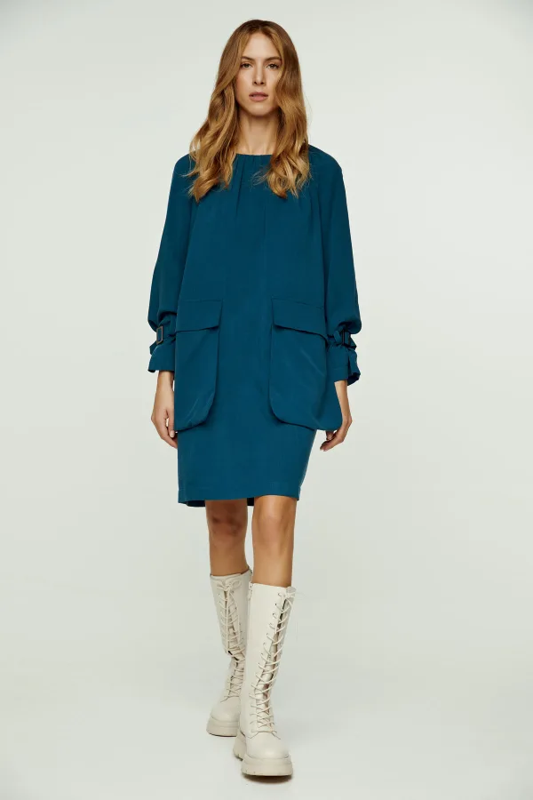 Deze petrolblauwe jurk is gemaakt van geweven tencel. Het heeft lange raglanmouwen en een wijde ronde halslijn met plooien. De mouwen kunnen met een bandje en een plastic gesp bij de pols worden omgeslagen. Er zijn twee oversized loshangende zakken met kleppen aan de voorzijde van het kledingstuk. De jurk sluit achteraan met een verborgen ritssluiting. De jurk sluit achteraan met een verborgen ritssluiting.