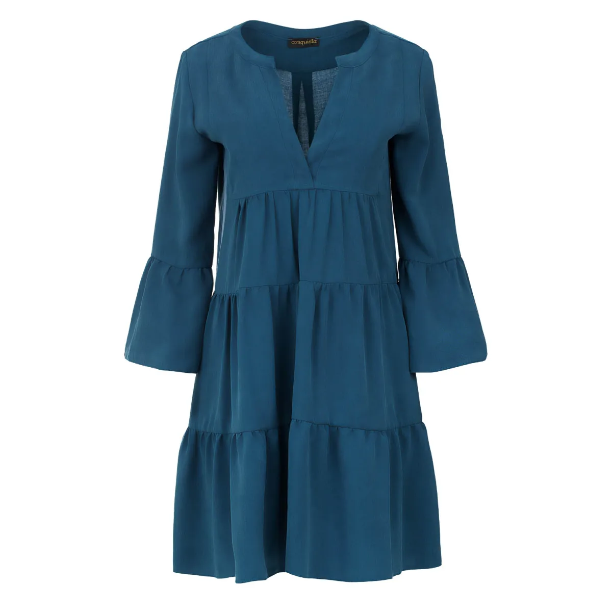 Jurk met geplooide naden van geweven stof. Driekwart klokmouwen. Ronde hals met een V-opening van 24 cm aan de voorzijde. Drukknoop aan de binnenkant onderaan de V om te voorkomen dat deze te veel opent. Langwerpige dubbele stof onder de V-opening aan de voorkant. De jurk heeft twee 24 cm brede, geplooide panelen. Dubbele plooi aan de achterkant. Losvallend A-lijnmodel. Valt boven de knie.
