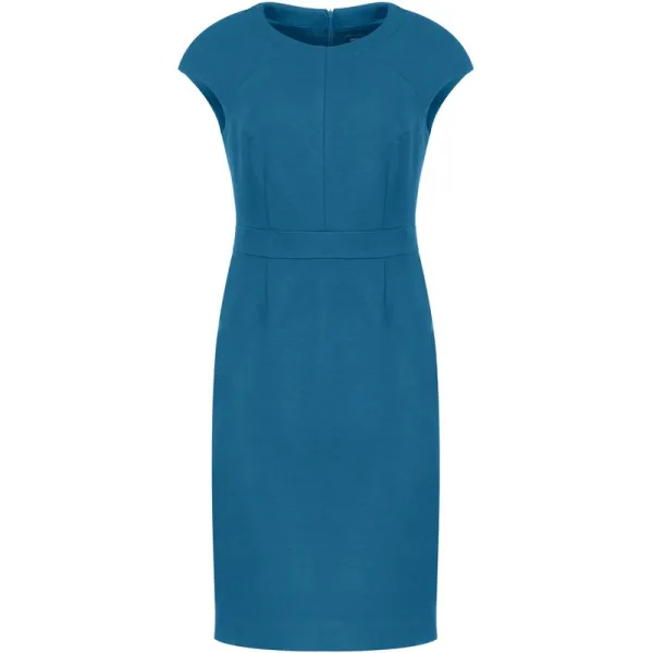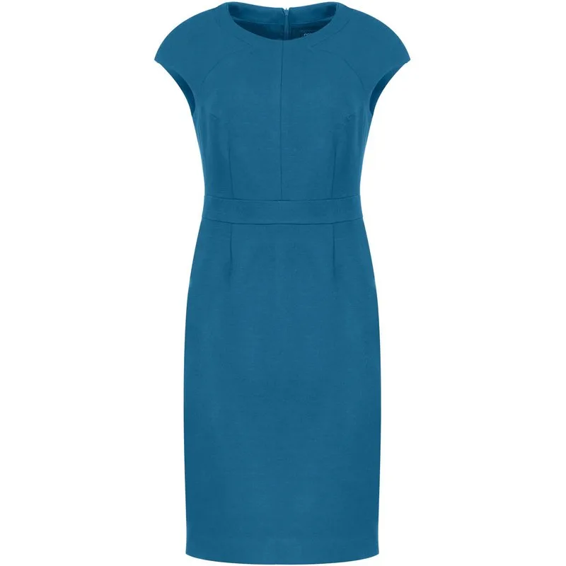 Petrol jurk met kapmouwtjes. Ronde halslijn. Darts bij de buste. Verborgen ritssluiting achteraan. Split op de rug. Gevoerd. Aansluitend. Knielengte. Ons model is 176cm en draagt maat 36/S. Afmetingen voor maat 36/S (in cm): Schouder -48, Borst-41, Taille-38, Onderkant-44, Lichaamslengte-102. Accessoires zijn niet inbegrepen. 70%viscose-25%polyamid-5%elastan