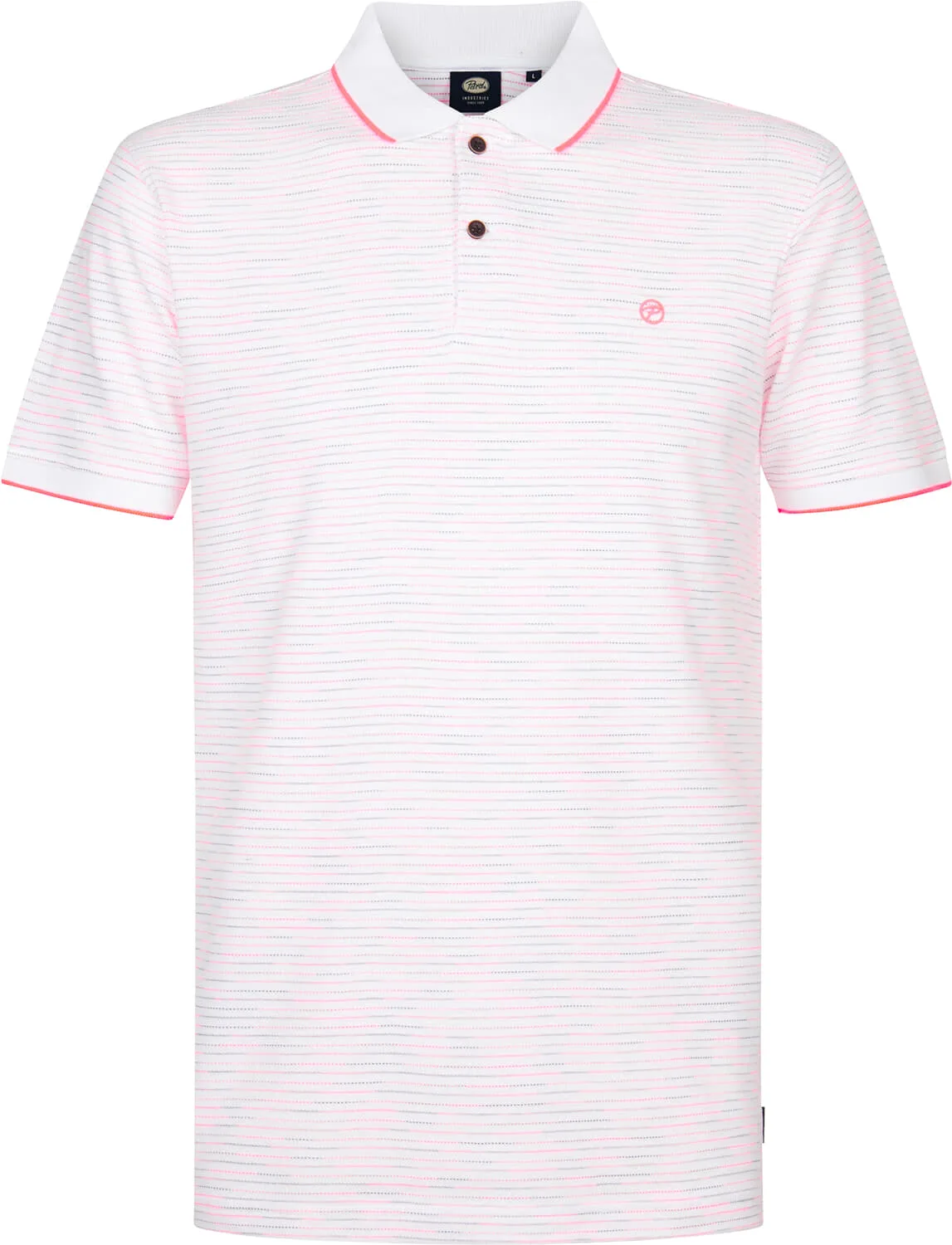 Polo van Petrol met polokraag, korte mouwen en regular pasvorm. Het subtiele streeppatroon geeft een sportieve, casual uitstraling. De knoopsluiting en contrasterende afwerking bij kraag en mouwzoom zorgen voor een verzorgde finish. Combineer met jeans of chino voor een relaxte outfit.