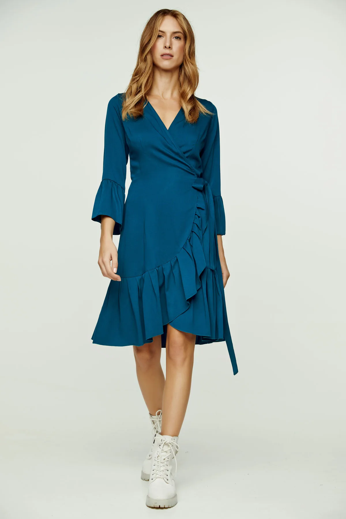 Petrol Wrap Dress Viscose met klokmouwen. Prijzen