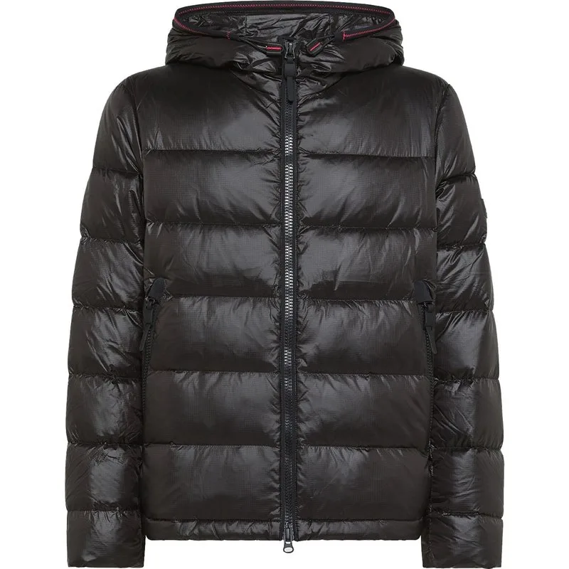 Gewatteerd jack van nylon ripstop met horizontale quilting. Ondanks het lichte gewicht is de stof scheurbestendig dankzij de kenmerkende schaakbordstructuur. De wattering zorgt voor een zacht, warm en licht volume. Elastische trekkoorden aan de capuchon met hoge hals en de zoom zorgen ervoor dat het model goed om het lichaam zit, waardoor de warmte en het comfort worden geperfectioneerd.