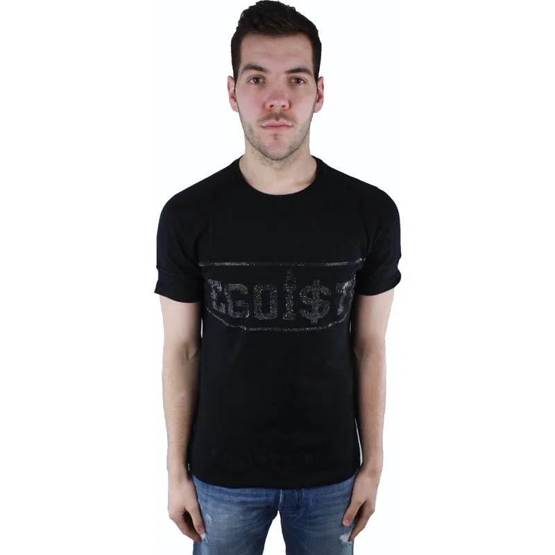 Philipp Plein Benton Hotfix MTK0958 T-shirt. Zwart grafisch T-shirt met ronde hals. "Egoiste" over de borst. Phillip Plein Zichtbare branding. 100% katoen. "Philipp Plein" aan de onderkant van het T-stuk