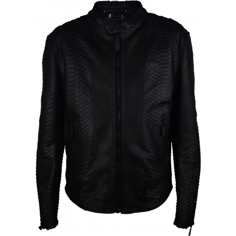 Philipp Plein bikerjack van zwart pythonleer.Matzwarte metalen details.Rits- en knoopsluiting bij de kraag.Zwart logoplaatje op de borst.Twee zijzakken met ritssluiting.Twee horizontale voorzakken met ritssluiting.Ritssluiting op de mouwen.Gemaakt in Italië.