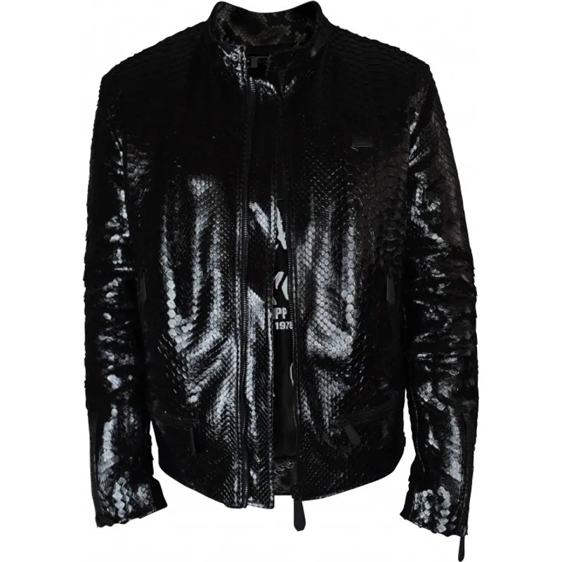 Philipp Plein jasje in zwarte python.Mao kraag met drukknoop.Ritssluiting aan de voorkant.Mouwen en steekzakken met ritssluiting.Metalen logo-juk aan de voorkant.Zwart metalen juk Philipp Plein aan de achterkant.Beperkte collectie.