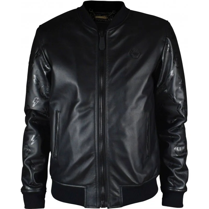 Philipp Plein bomberjack van zwart leer met ritssluiting.Details van zwarte ontwerpen op de leren mouwen.Zwart elastiek in de taille en manchetten.Zwarte PP-logoplaat op de voorkant.Zijzakken.Gemaakt in Italië.